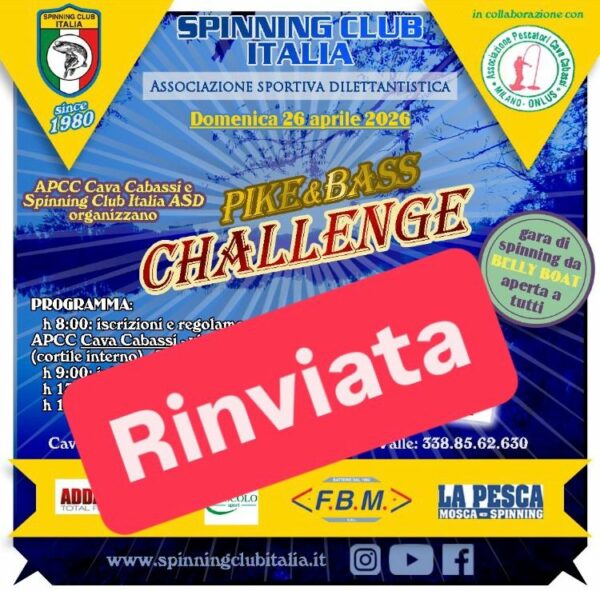 La manifestazione “Pike&Bass” in Cava Cabassi prevista per questa domenica è rimandata a causa della frega dei bass presenti e dei livelli bassi della Cava. La manifestazione è pertanto rimandata al periodo autunnale.